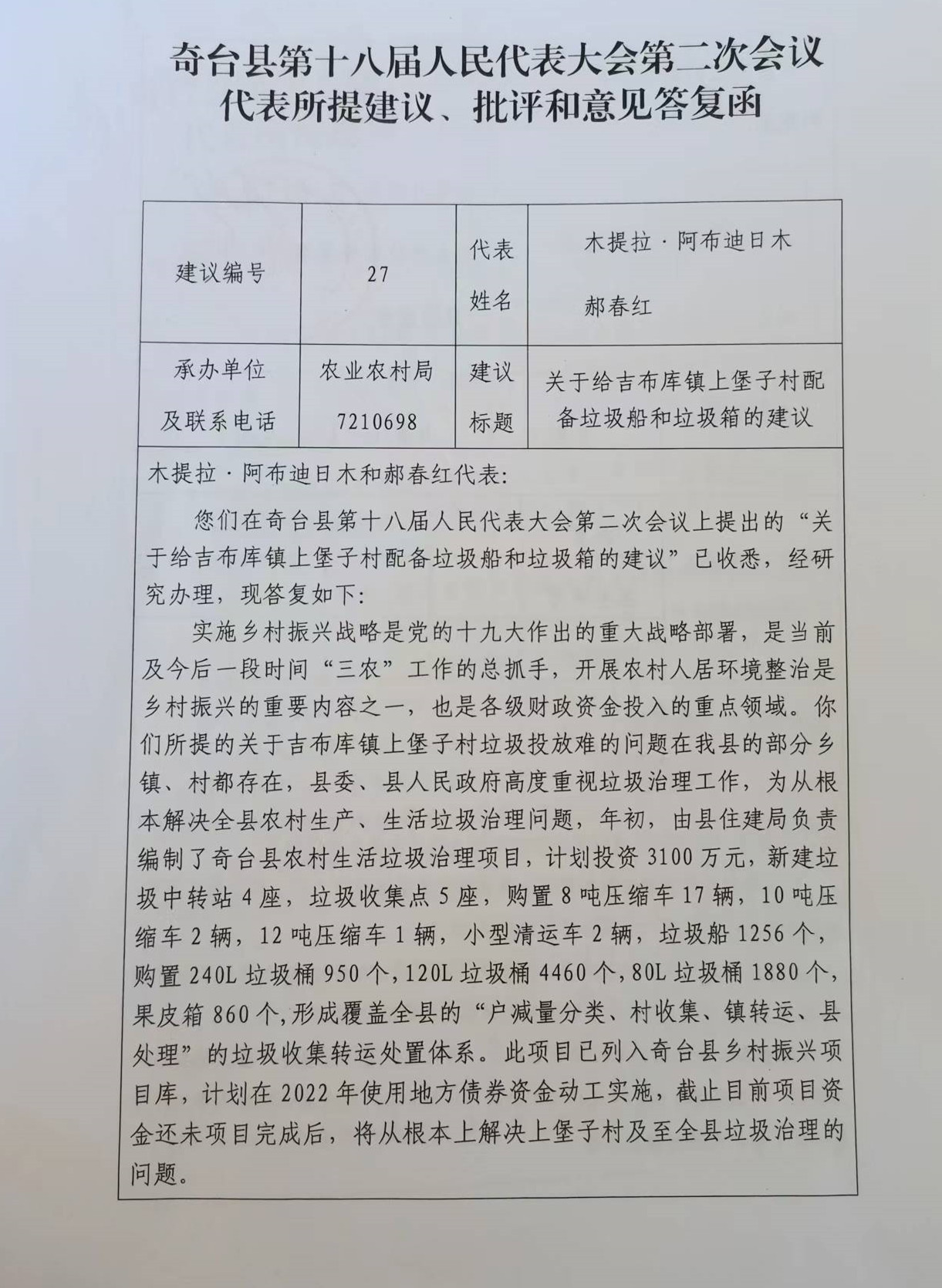关于给吉布库镇上堡子村配备垃圾船和垃圾箱的建议