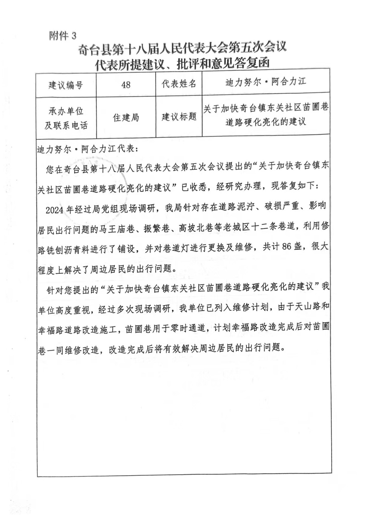 奇台县第十八届人民代表大会第五次会议代表所提建议、批评和意见第48号答复函
