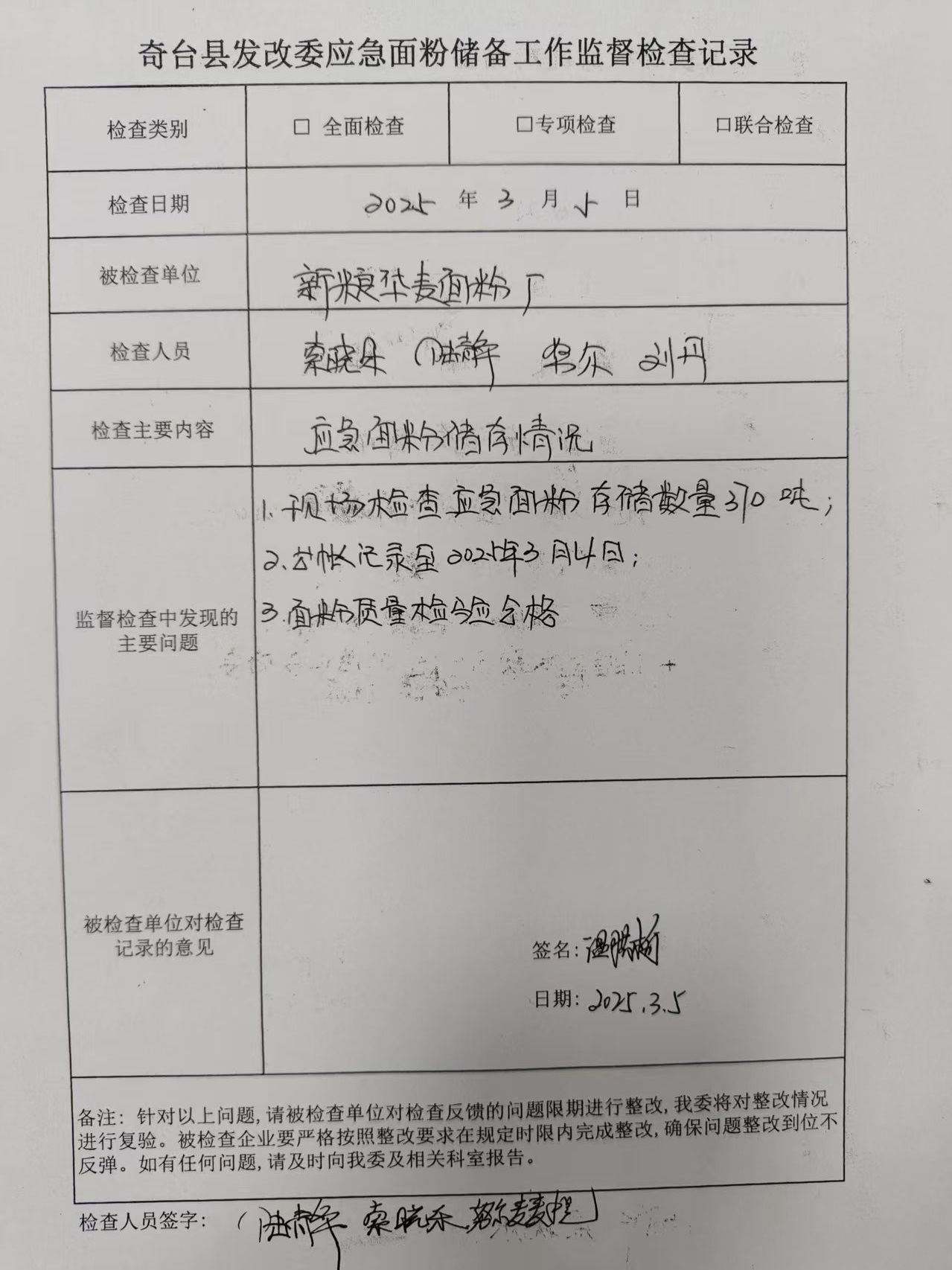 3月对昌粮集团奇台公司、天山面粉厂和新粮华麦三家企业开展第一季度巡查工作,暂未发现违法行为。