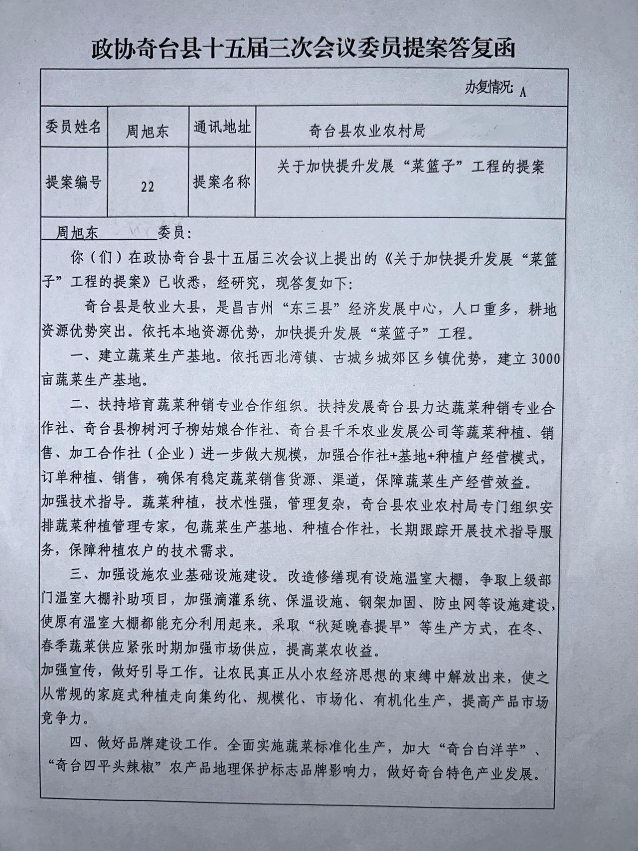 对政协奇台县十五届三次会议25号委员提案的答复函